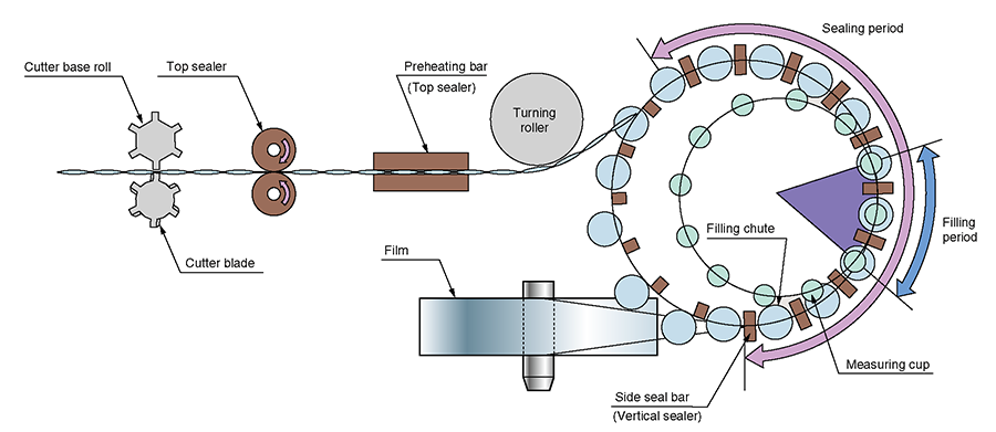 The rotary system performs pouch forming, filling and sealing operations in a horizontal direction to achieve an ultra-fast packaging rate of 1000 pouches per minute.