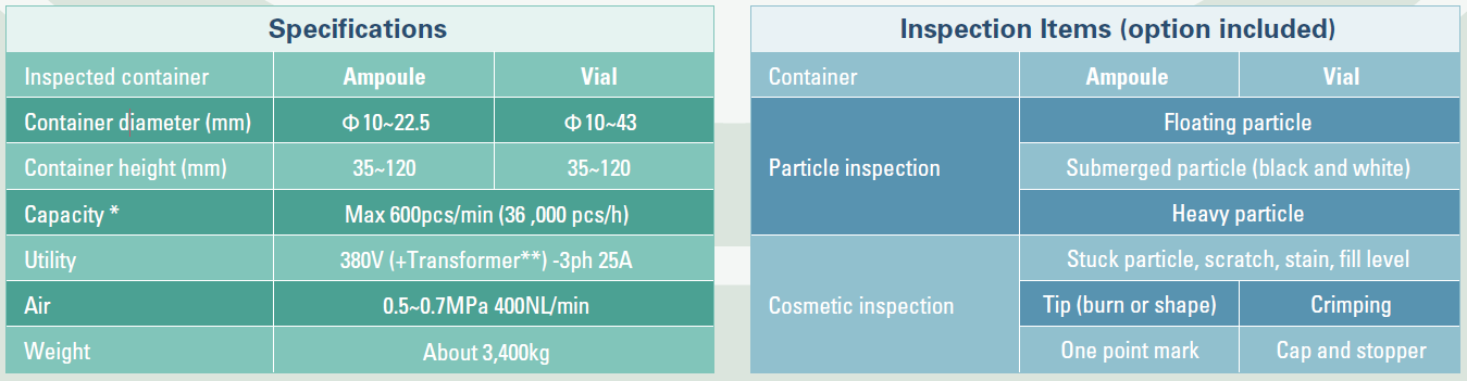 (2)Inspection rotor ? Inspection accuracy with high resolution area sensor ? Dual optical system to detect black and white particles ? Short flash strobe lighting to inspect amber colored products ? Accurate and various spin control with direct spin motor ? Precise oscillating technology |