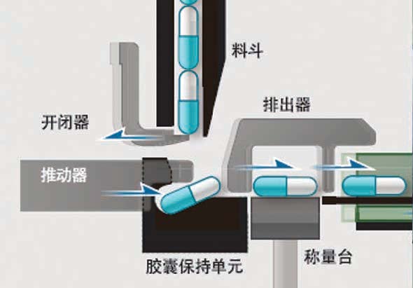![]() | 通過開閉器使料斗內的膠囊逐一落下, 在保持單元停留并抑制下落時產生的晃動, 然后利用推送器送至稱量臺。 |