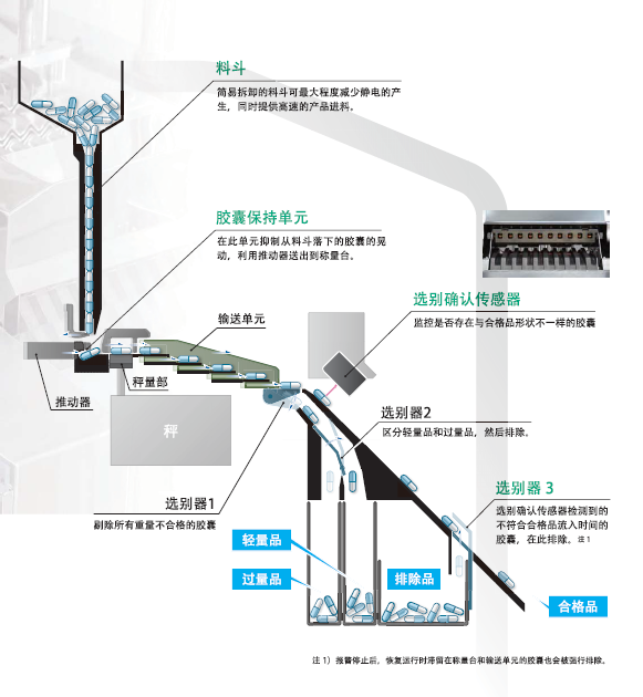 (3)監控和跟蹤裝置內的全數膠囊 通過3個選別器排出重量不合格的膠囊 | |